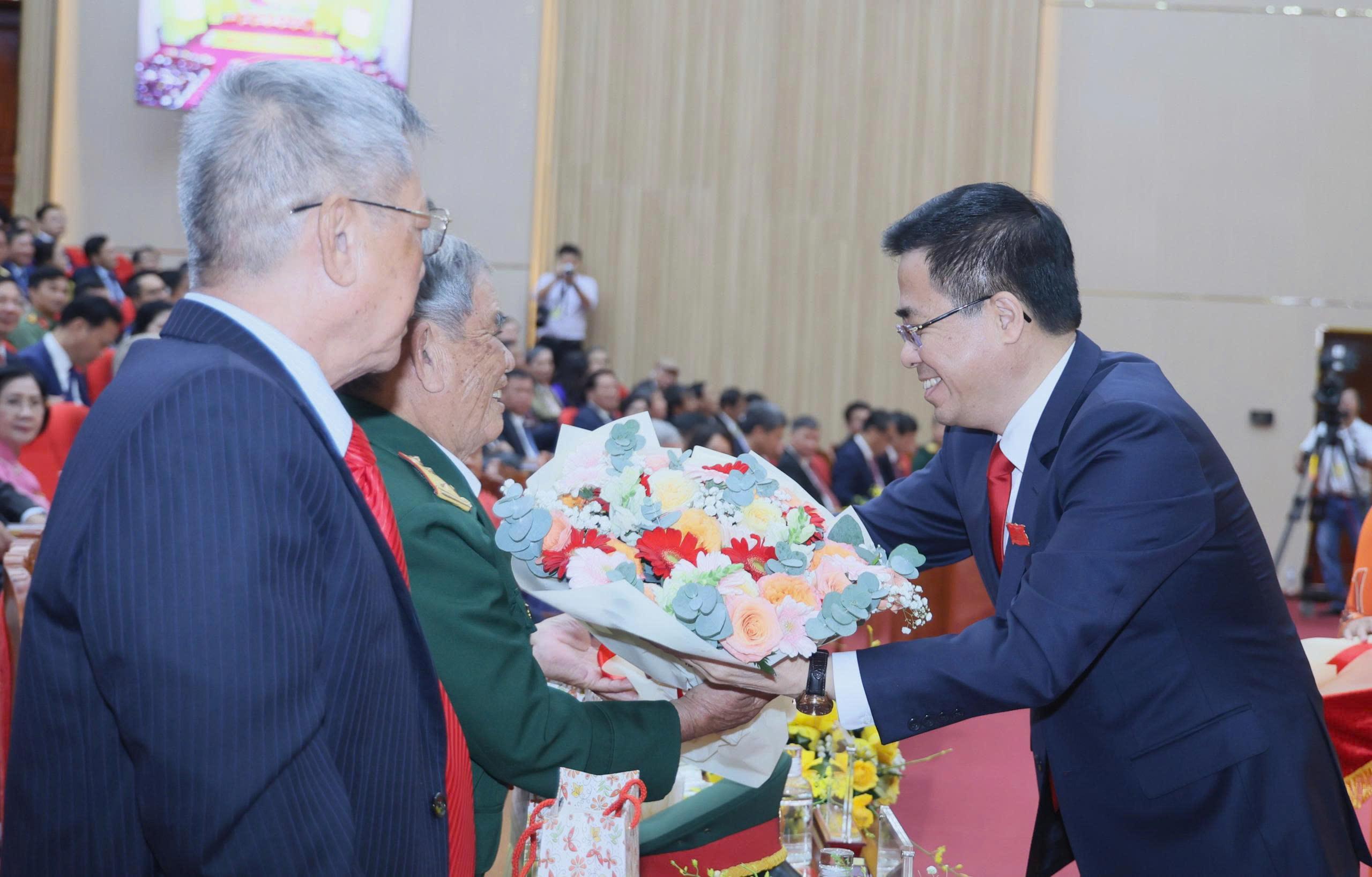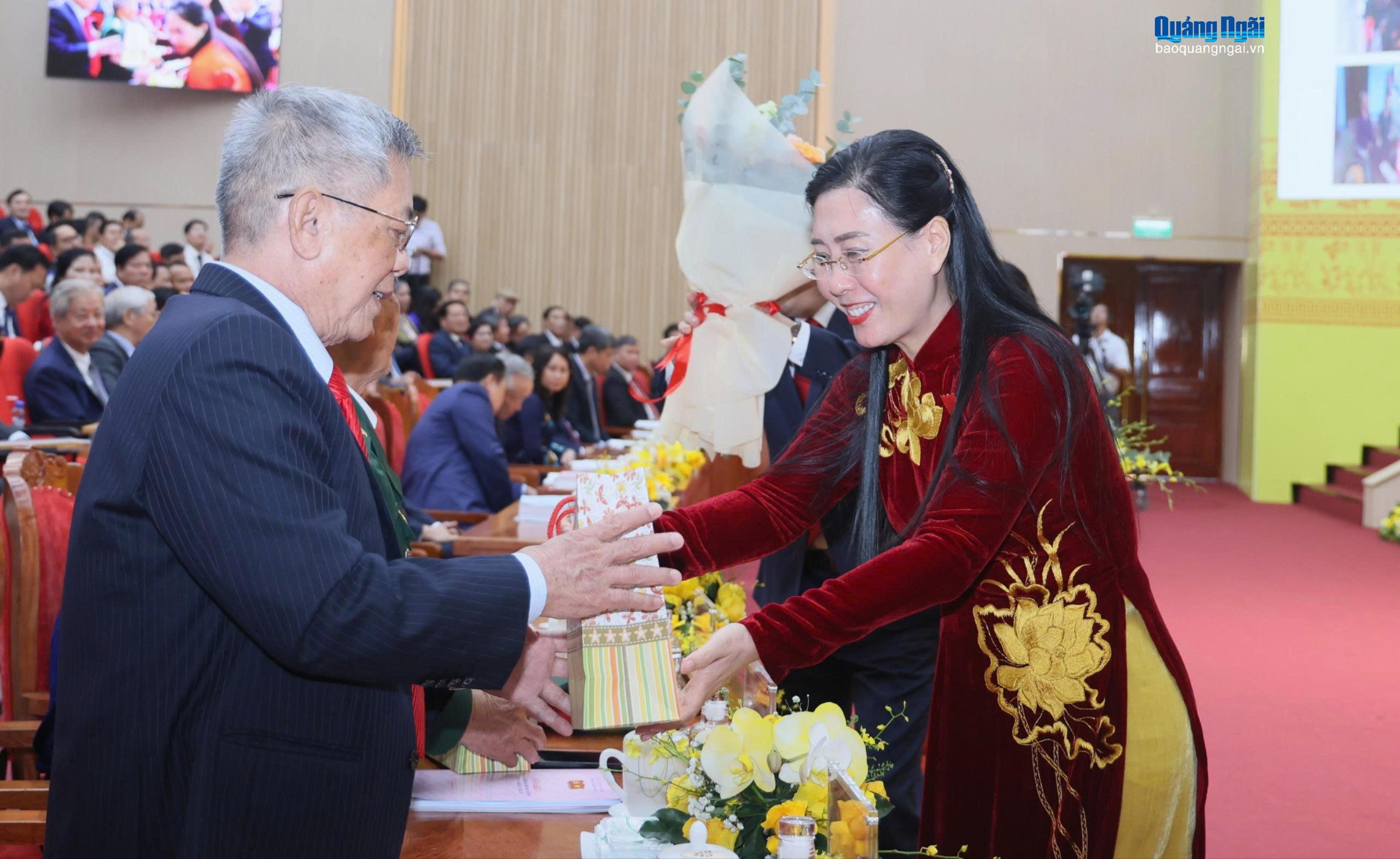 Ủy viên Trung ương Đảng, Bí thư Tỉnh ủy Bùi Thị Quỳnh Vân tặng quà cho các Mẹ Việt Nam Anh hùng, Anh hùng Lực lượng vũ trang nhân dân, Anh hùng Lao động thời kỳ đổi mới tại phiên khai mạc đại hội.